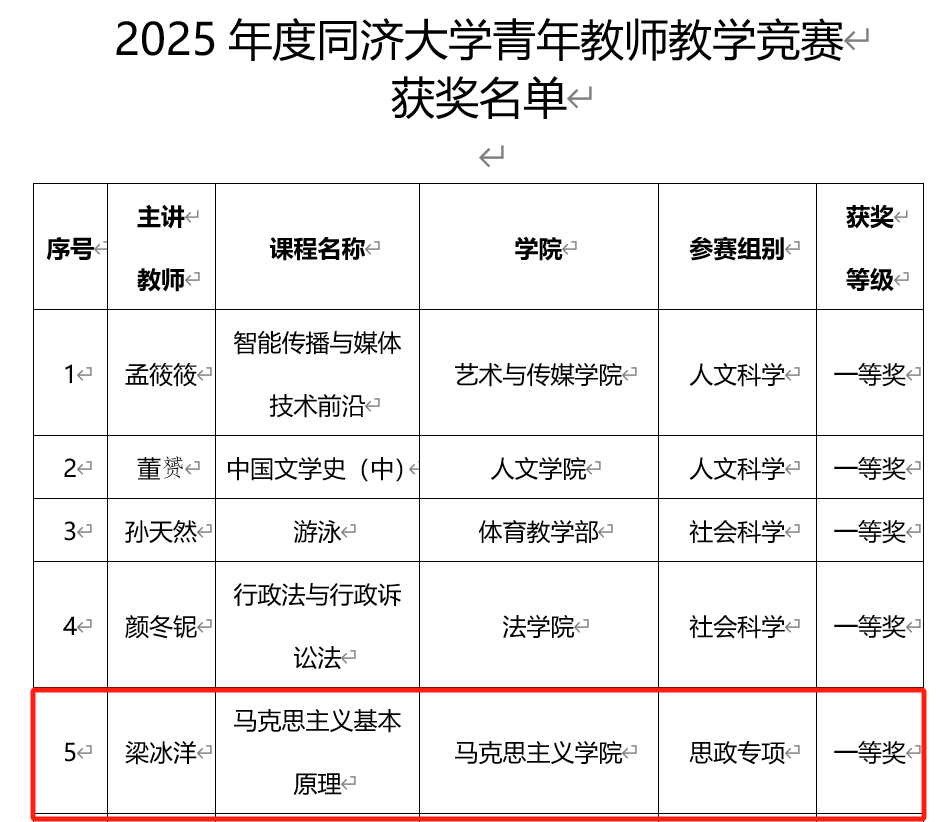 近日,学校公布2025年度同济大学青年教师教学竞赛获奖名单。据悉,经学院初赛选拔、学校网络和现场评审、公示等环节,最终评选出一等奖13项、二等奖15项、三等奖19项,优秀组织奖9项。其中,我院青年教师梁冰洋、董玥荣列其中,分别喜获一等奖、三等奖。对以上两位老师,表示热烈祝贺!
